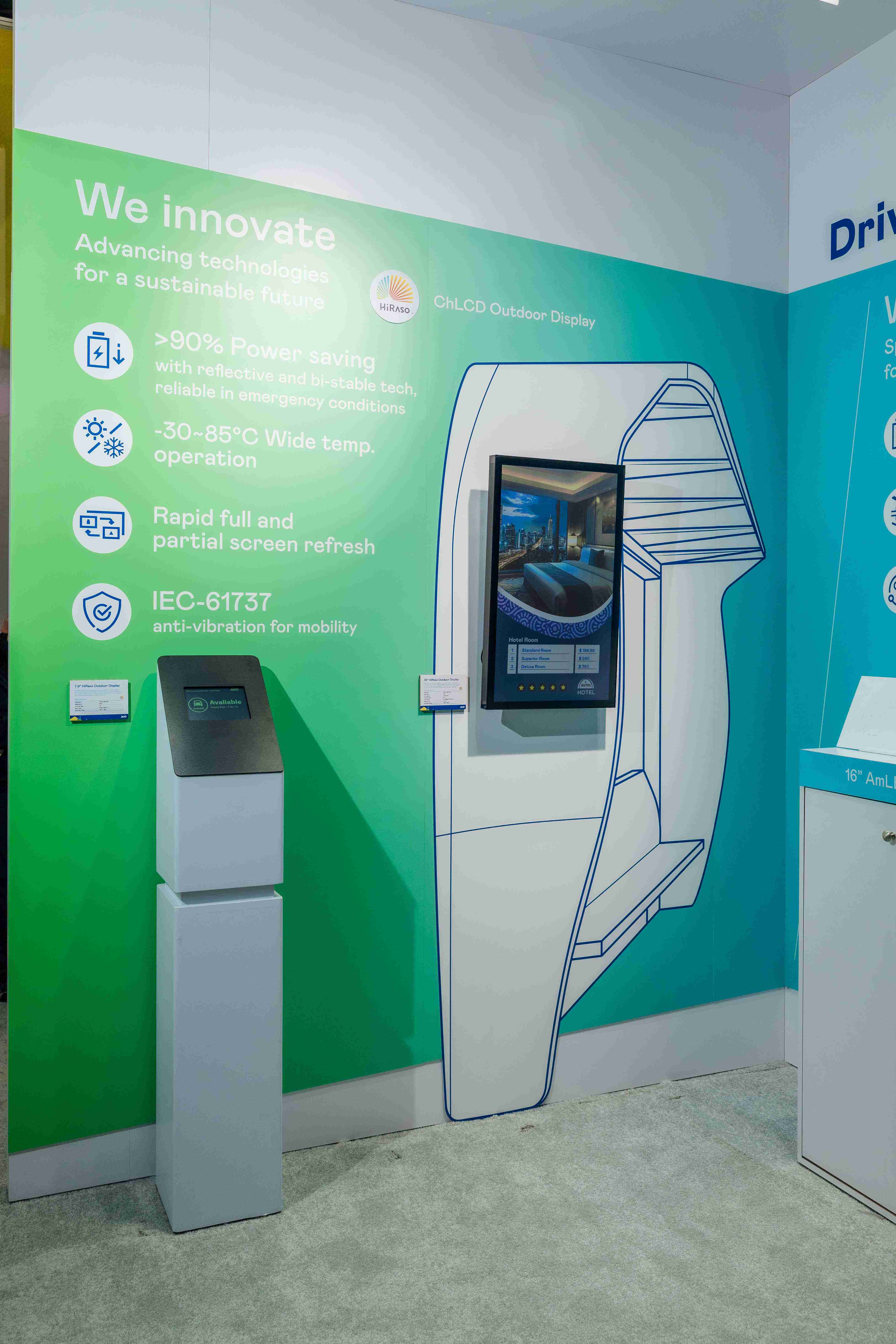 HiRaso胆固醇液晶显示器运用反射环境光线的方式,,,呈现影像显示时零耗能的环保省电诉求,,,,光线愈强愈能呈现绝佳的色彩饱和度及显示效果,,,同时在摄氏-30度至85度间宽温的使用优势,,,为户外电子看板的新首选。。