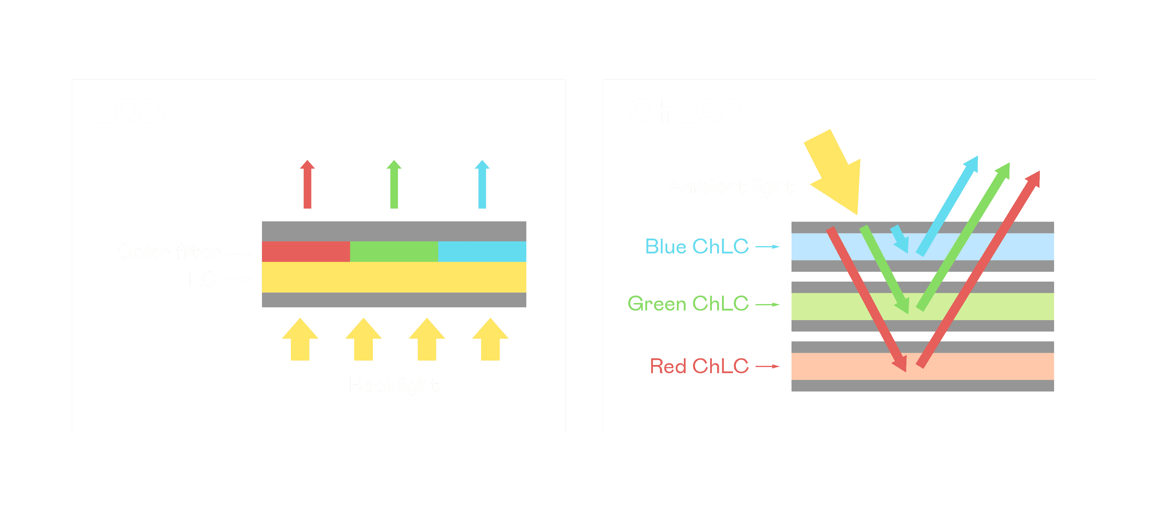 杏悦2胆固醇液晶显示器是由红、、绿、、蓝三层胆固醇液晶面板堆叠而成,,并采用无彩色滤光片设计,,,,减少环境光在反射过程中的损耗。。。。